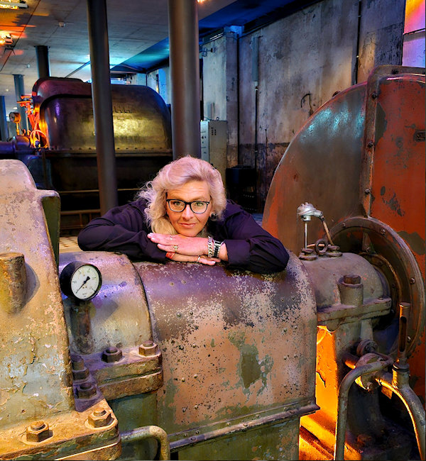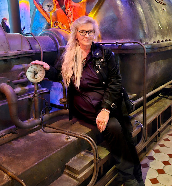 After the end of this exhausting and consuming phase of life, she found her way back to her artistic identity. She turned once again to music and also resumed drawing and painting. In her visual works, she combines her deep affection for the iron-producing industry - especially coking plants and blast furnaces - with her fascination for astronomy and science fiction. Industrial facilities appear embedded in cosmic, alien landscapes, while technical processes become symbols of energy, transformation, and time.